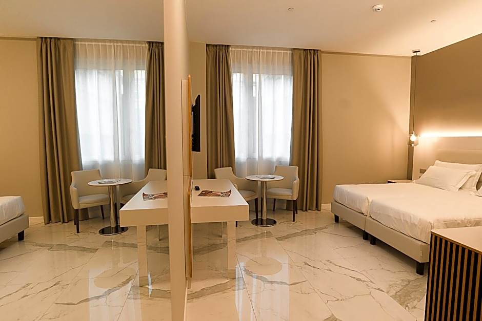 객실 선택 폭이 넓어, 2인을 위한 아늑한 퀸룸부터 더 넓은 스위트 및 가족·단체에 적합한 정원 전망 타입까지 다양합니다. 옵션으로는 디럭스룸과 퀸룸, 두오모 스위트(Suite Duomo), 가든 뷰(Garden View), 최대 성인 10명·어린이 6명까지 수용 가능한 정원 전망 객실(Room With Garden View), 그리고 대규모 단체를 위한 아파트 스탠다드(Apartment Standard)가 있습니다.